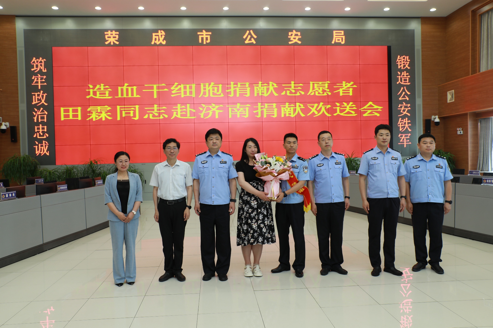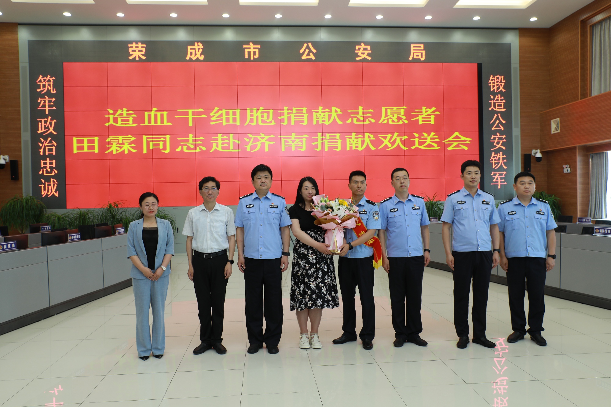 今年6月14日是第二十个世界献血者日,我国世界献血者日的活动口号为“捐献血液,分享生命”,活动主题是“汇聚青春正能量,无偿献血传爱心”。6月13日下午2点,威海市公安局海岸警察支队、荣成市公安局和荣成市红十字会联合举办了一场隆重热烈的欢送仪式,为荣成市第23例造血干细胞志愿者田霖赴济南捐献送行。荣成市政府副市长、市公安局党委书记、局长白雪松,威海市公安局海岸警察支队副支队长秦浩舰等相关领导出席了欢送会。