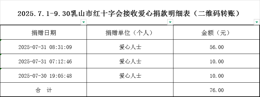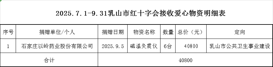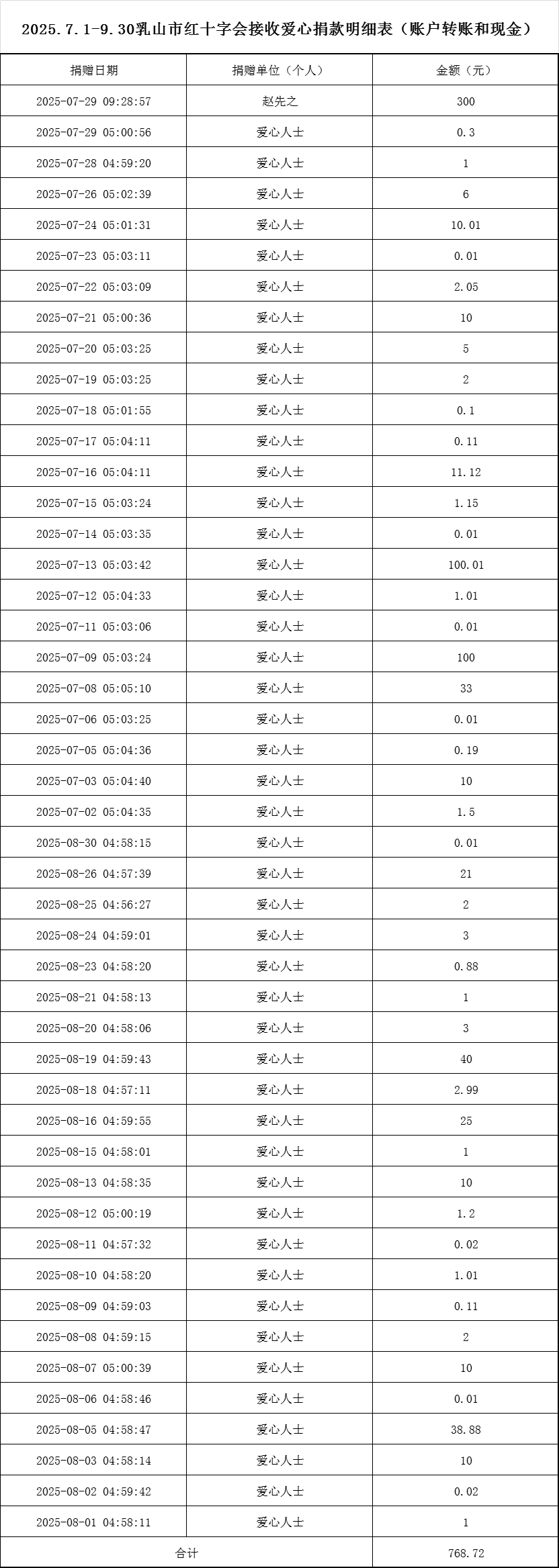 2025年,广大爱心企业、单位和社会各界爱心人士积极投身人道主义事业,发扬“人道 博爱 奉献”的红十字精神。自7月1日至9月31日,累计收到爱心款141799.98元,其中接收账户转账和现金100923.98元(定向捐款100000元),接收二维码转账76元,接收爱心物资40800元。详细明细如下: