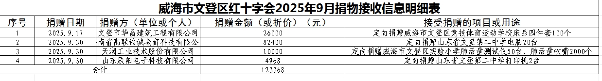 威海市文登区红十字会2025年9月捐物接收信息明细表