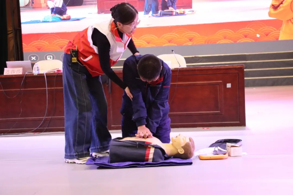 实操环节,大家分组使用模拟人反复练习,师资全程指导纠正,规范动作要领,确保同学们真学、真懂、真会,使急救知识不再停留于书本,而是转化为师生们手中守护生命的利器。
