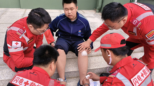 活动期间,一名学生不慎摔倒,造成膝盖擦伤、脚踝扭伤。现场待命的救援队员立即启动应急处置,凭借娴熟的专业技能,迅速为受伤学生进行伤口消毒、冷敷消肿、固定包扎等初步处理,有效缓解了学生的疼痛,避免伤势进一步加重。队员们快速的响应速度、规范的操作流程,赢得了师生们的一致称赞。