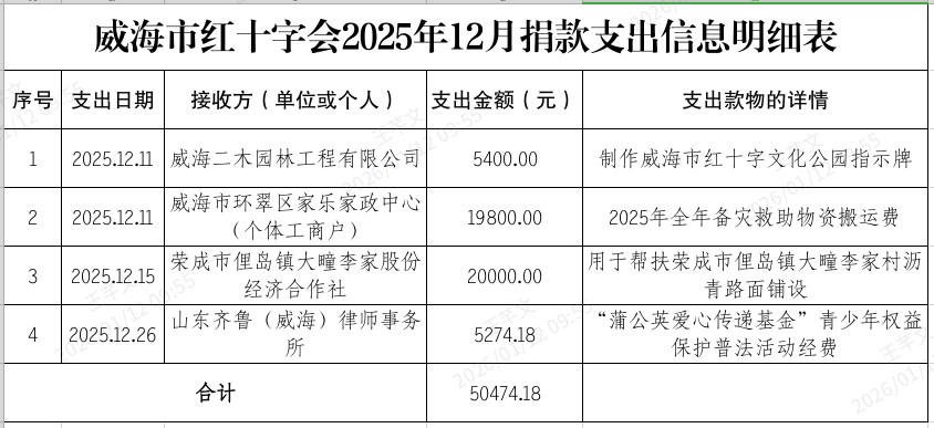 威海市红十字会2025年12月捐款支出信息明细公示