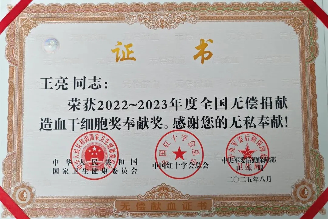近期,国家卫生健康委员会、中国红十字会总会、中央军委后勤保障部卫生局联合印发《关于表彰2022-2023年度全国无偿献血表彰奖励获奖者的决定》(国卫医急发〔2025〕11号),对成功捐献造血干细胞的志愿者予以表扬,以表彰他们挺身而出捐献造血干细胞、挽救他人生命的高尚义举。