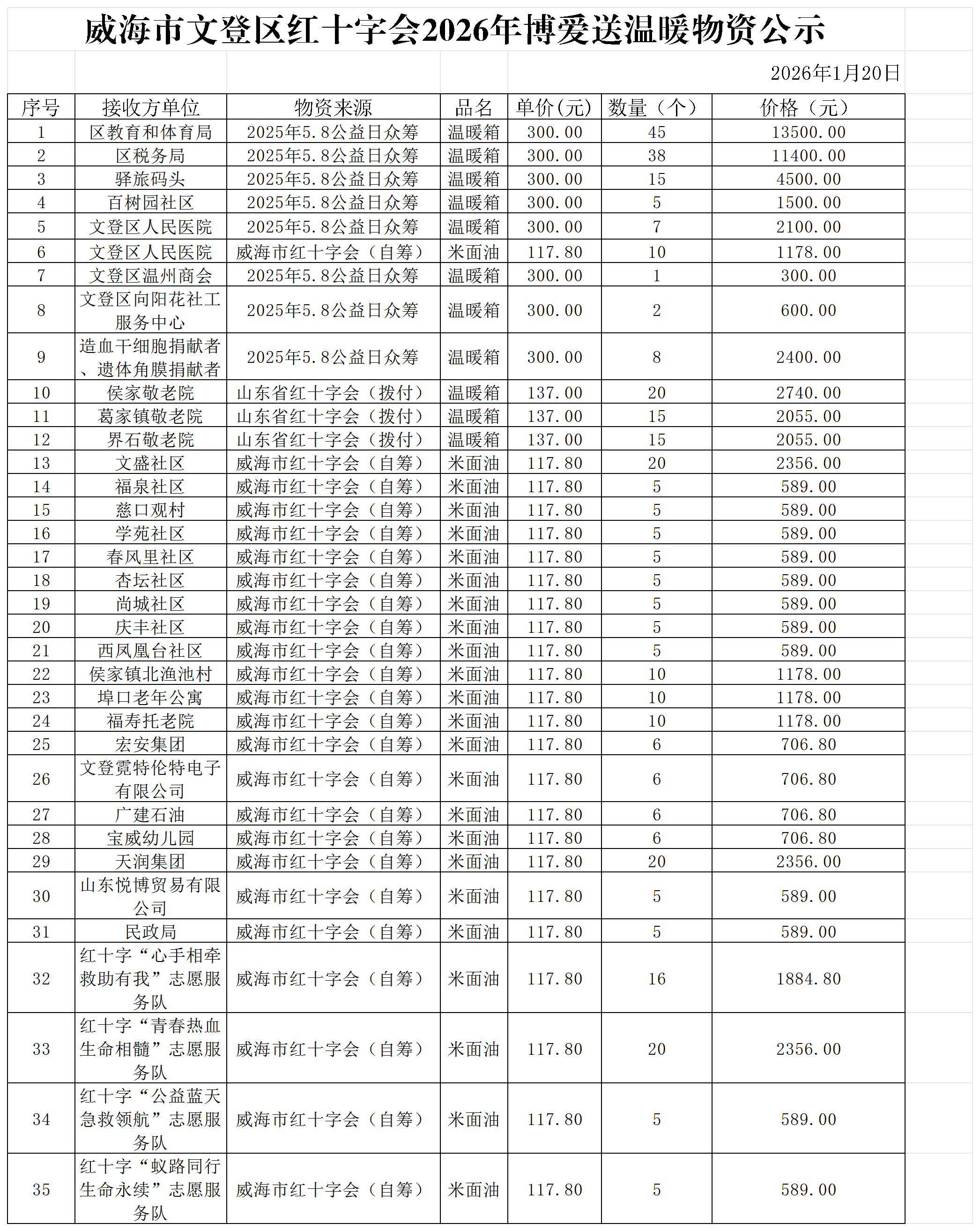 威海市文登区红十字会2026年博爱送温暖物资公示
