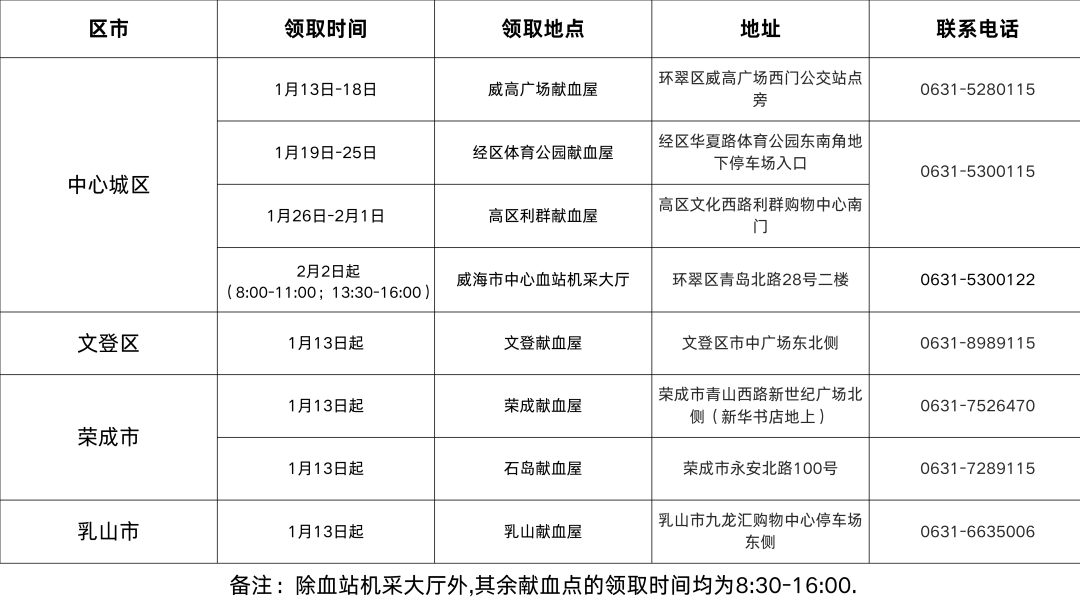 注意事项:为方便广大献血者,中心城区安排四个献血点巡回发放,请根据自己的时间合理安排,就近领取。文登、荣成、乳山的献血者请到当地献血屋领取。如有问题,请拨打表内相应的联系电话咨询。