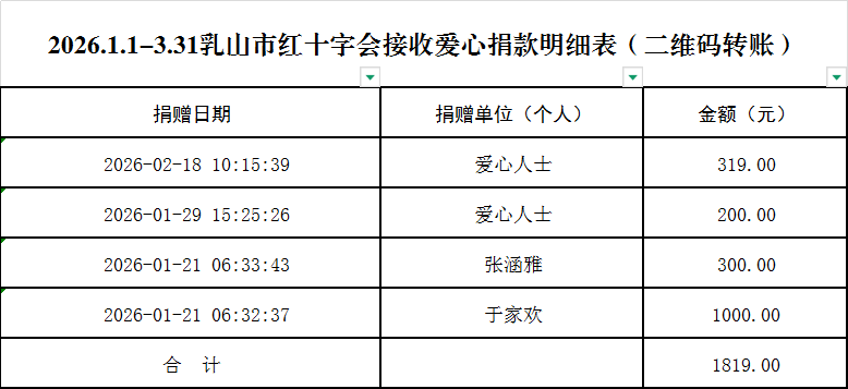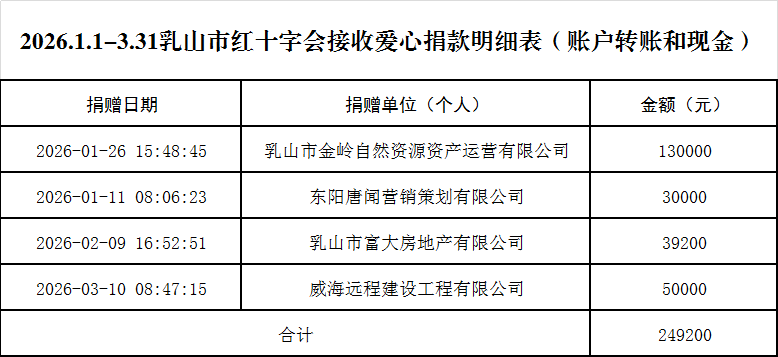 2026年,广大爱心企业、单位和社会各界爱心人士积极投身人道主义事业,发扬“人道 博爱 奉献”的红十字精神。自1月1日至3月31日,累计收到爱心款251019元,其中接收账户转账和现金249200元(定向捐款249200元),接收二维码转账1819元。详细明细如下: